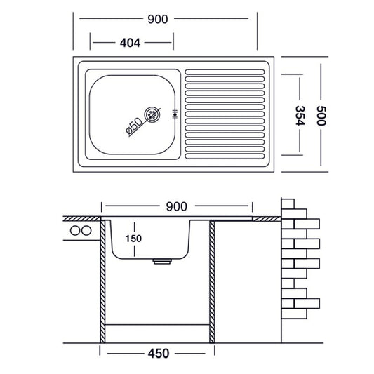 Évier de cuisine à poser avec égouttoir droit en acier 50x90 cm