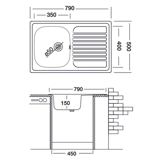 Évier de cuisine encastrable en inox avec égouttoir à droite 50x79 cm