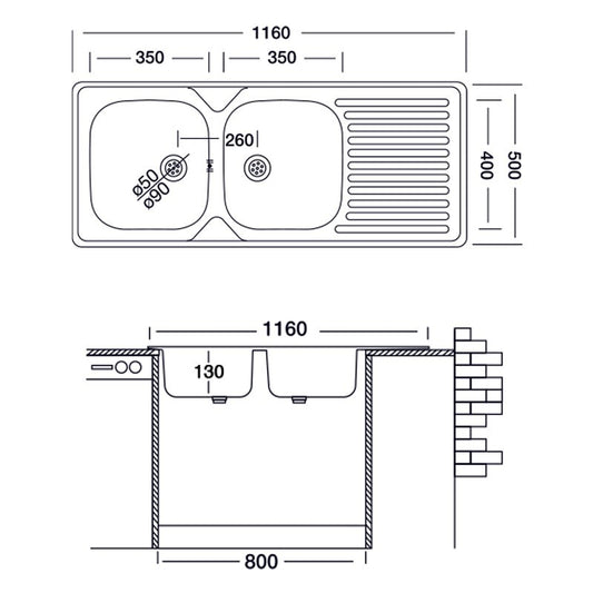 Évier de cuisine avec deux cuves en acier intégrées, égouttoir à droite, 50x116 cm