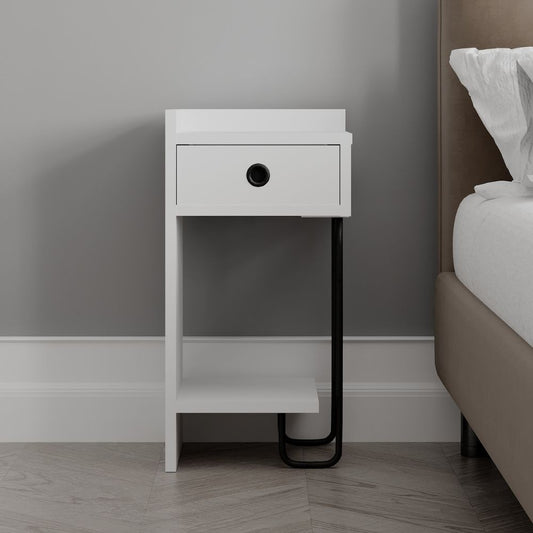 Table de chevet Sirius blanche avec tiroir et pied gauche en métal noir