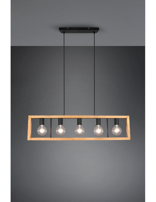 Lustre Cage Rectangulaire Agra en Bois 5 Lumières Bois Naturel et Éclairage Trio Noir