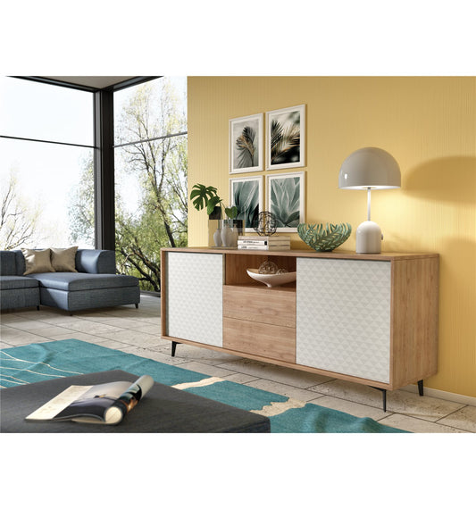 Buffet avec structure en chêne et portes Dama blanches. Ouverture push en chêne et portes DAMA blanches.