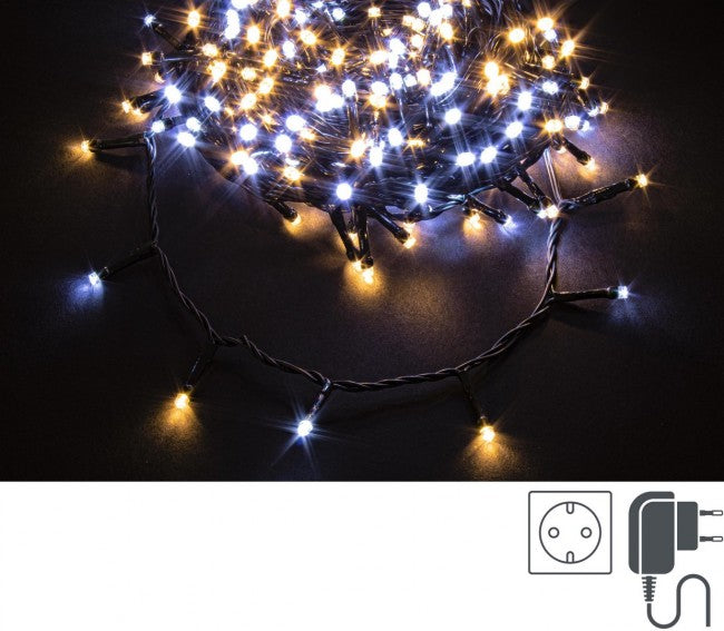 Chaîne 500 LED, lumière blanche classique, taille LED 5 mm non remplaçable. Fil vert, longueur totale du fil 27,95 m, longueur du câble d'alimentation 3 m, longueur du fil lumineux 24,95 m, distance LED 5 cm. Equipé d'une prise Schuko. 8 jeux de lumière avec mémoire. Pour usage interne-externe IP44. Avec boîte de couleur. Avec transformateur 31V6W.