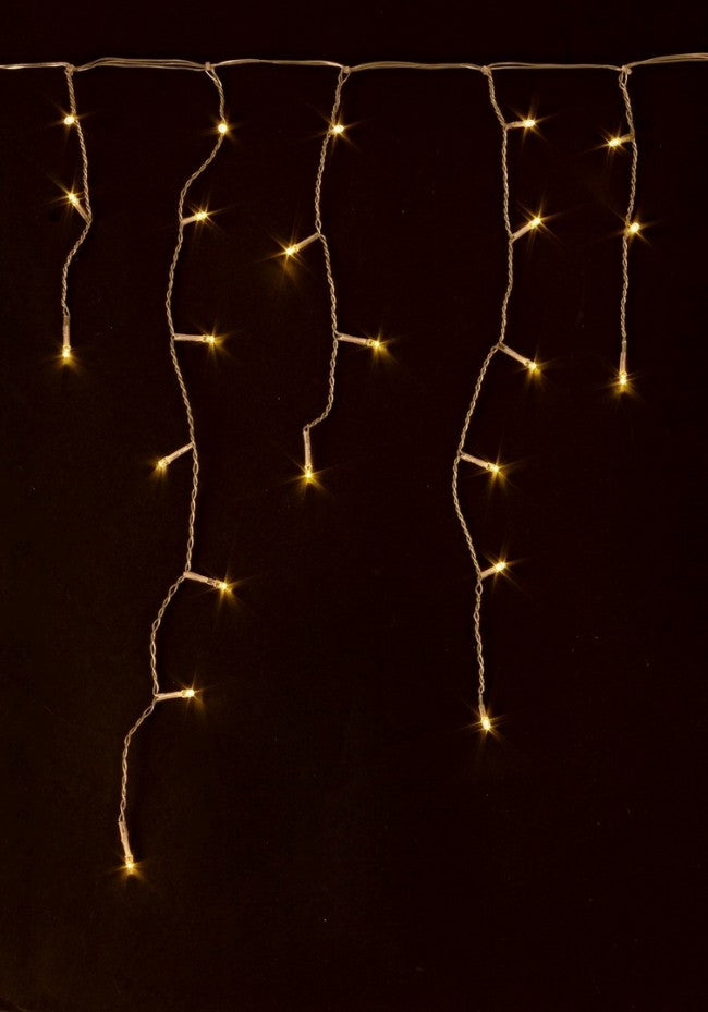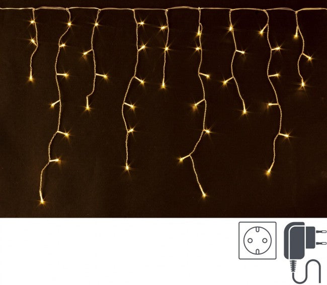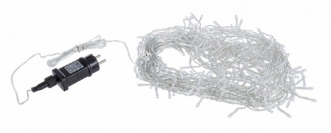 Rideau 100Led, Lumière classique, taille LED 5 mm. Fil transparent 0,15 mm2, séquence de fils lumineux 3-7-4-6, longueur totale 5 m, longueur du câble d'alimentation 3 m, longueur du fil lumineux 2 m, distance LED 10 cm, distance entre les fils lumineux 10 cm. Equipé d'une prise Schuko. 8 jeux de lumière avec mémoire. Pour usage interne-externe IP44. Avec boîte de couleur. Avec transformateur 31V3.6W