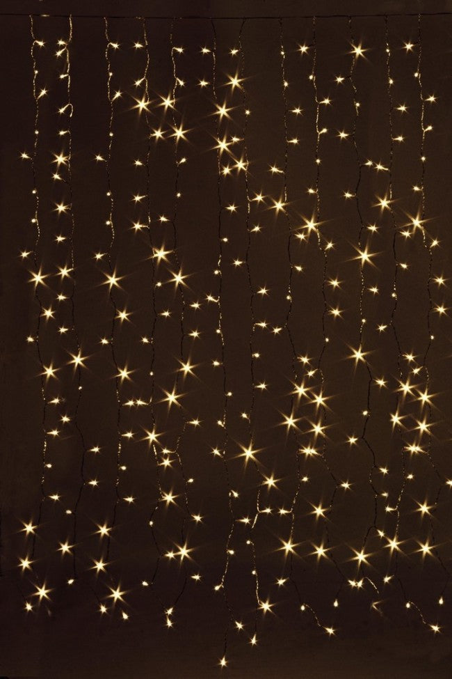 Rideau 400Led, lumière classique, taille LED 5mm. Fil transparent, taille 2x2m, longueur totale 5m, longueur du câble d'alimentation 3m, longueur du fil lumineux 2m, distance LED 10cm, distance entre les fils lumineux 10cm. Equipé d'une prise Schuko. 8 jeux de lumière avec mémoire. Pour usage interne-externe IP44. Avec boîte de couleur. Avec transformateur 31V3,6W.