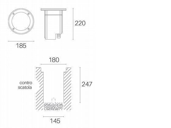 Structure en aluminium moulé sous pression. Anneau de couverture en acier inoxydable. Diffuseur en verre transparent incassable : max 500kg. Parabole réfléchissante en aluminium. Boîte extérieure en thermoplastique. Joint en silicone et accessoires de fixation. Presse-étoupe PG11. Douille en porcelaine avec douille E27. Hauteur de la lampe : maximum 145 mm. Convient exclusivement aux lampes à économie d'énergie. Lampe exclue. Alimentation 230V ~ 50Hz. Classe de protection : IP65 Puissance maximale de la lampe : 40 W