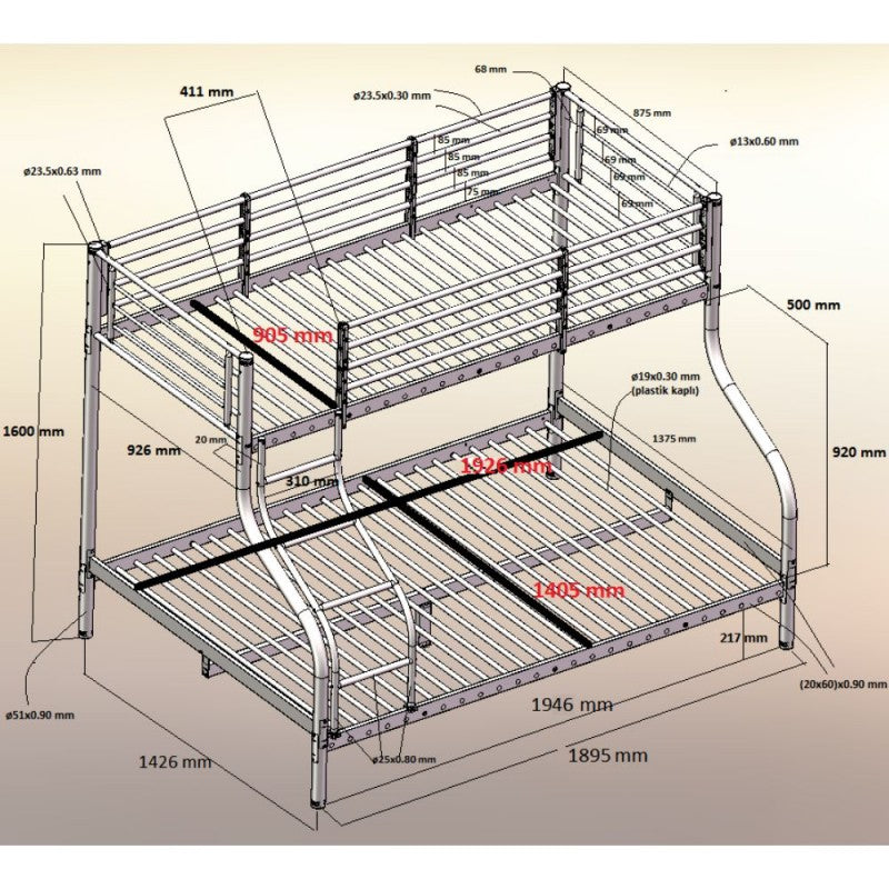 Lit superposé en tube d'acier peint gris 140x190xh.160 cm