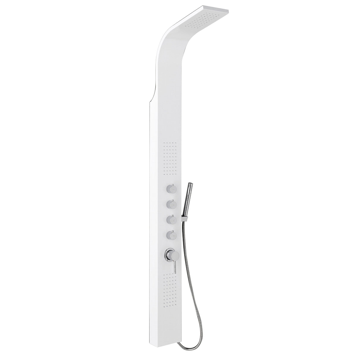 Unité murale multifonction blanche modèle Danubio. Ce produit est fabriqué en aluminium peint et offre 3 fonctions sélectionnables : douchette à main, pomme de douche et jet horizontal. Le tuyau en acier inoxydable est équipé d'une double couture et est extensible de 150 à 200 cm. Les dimensions de ce produit sont de 155x166,5x46,5 cm (LxHxP).