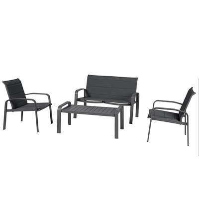 Trapuntata per un comfort ottimale Schiuma ad asciugatura rapida. Struttura trattata con resina epossidica antiruggine. Prodotto trattato contro lo scolorimento Piedini regolabili per compensare le irregolarità del pavimento e fornire una migliore stabilità. Numero di persone/Tempo di montaggio: 2 persone / 20 min Peso: 560 g/m² Peso massimo consentito per persona: 110 kg Descrizione dell'assortimento: Struttura: Grafite. Sedile/schienale: antracite. Dimensioni prodotto: L. 64 x P. 31 x H. 116 cm Dimensioni dettaglio: Poltrona (X2): L. 66 X P. 70 X H. 84 cm (5,2 Kg). Divano 2 posti: L. 122 X P. 70 X H. 84cm (8,1Kg). Tavolino: L.104,7 X P. 60 X H.46 (4,8Kg). Materiale: ALLUMINIO