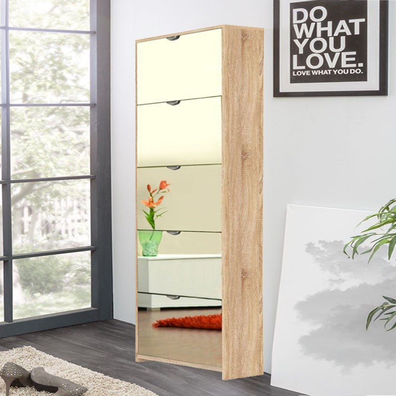 Meuble à chaussures avec 5 abattants miroir, structure en chêne sonoma, 58x17xh.177 cm