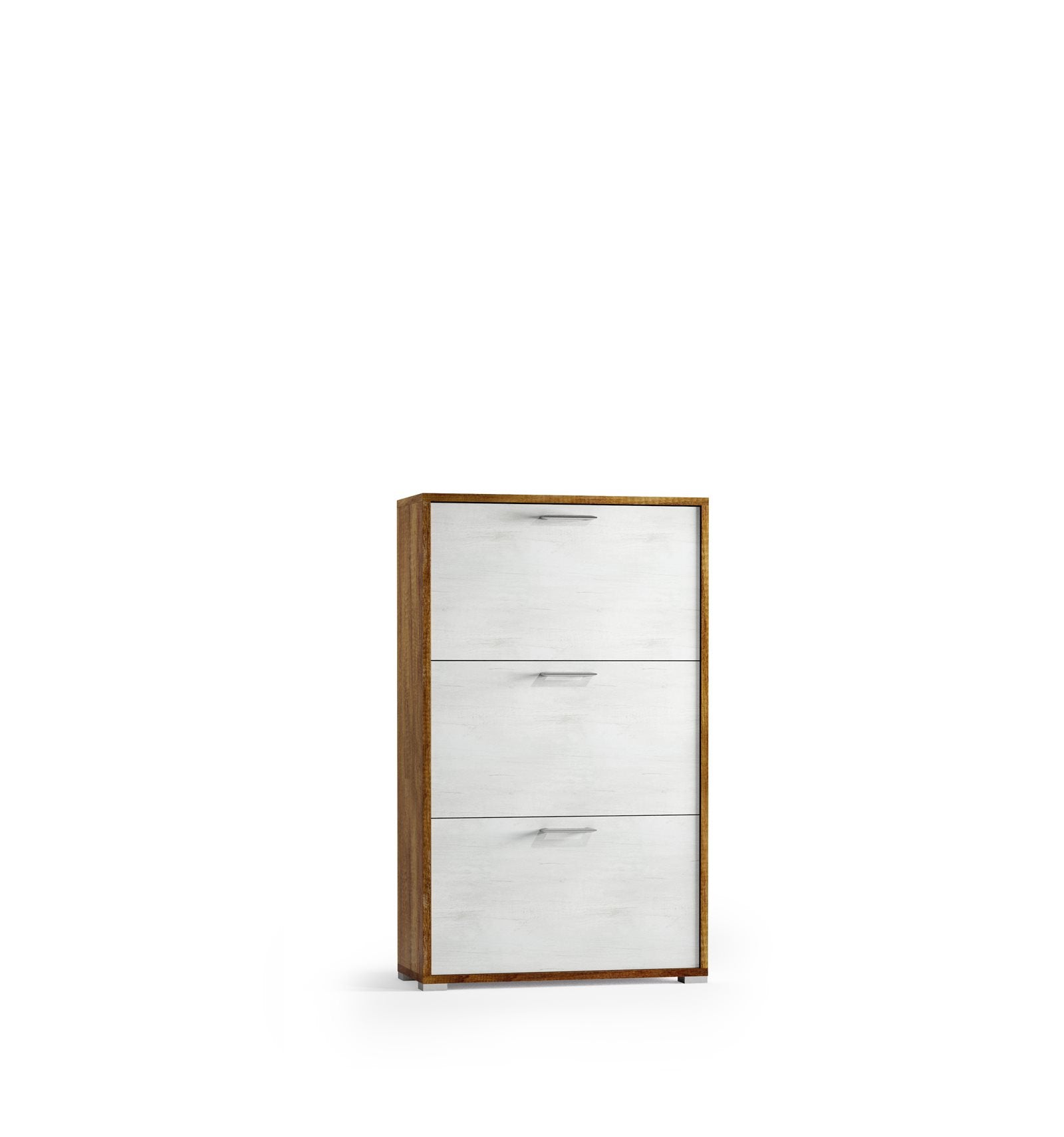Meuble à chaussures double profondeur 3 portes L 67 x H 112 x L 28 cm chêne foncé avec portes canyon blanches, idéal pour 18 paires de chaussures. Ce meuble à chaussures de qualité est entièrement produit en Italie et se caractérise par trois conteneurs en plastique spécialement conçus pour organiser les chaussures de manière pratique et fonctionnelle. Les pieds en plastique assurent stabilité et durabilité dans le temps.