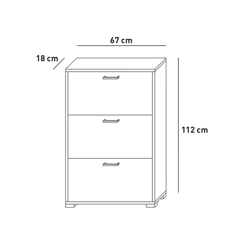 Étagère à chaussures à trois portes. Jusqu'à neuf paires de chaussures.