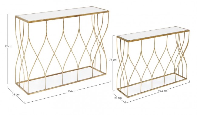 Dimensions de la console G : Longueur : 104 cm Profondeur : 33 cm Hauteur : 79 cm ; Dimensions de la console P : Longueur : 96,5 cm Profondeur : 28 cm Hauteur : 71 cm
